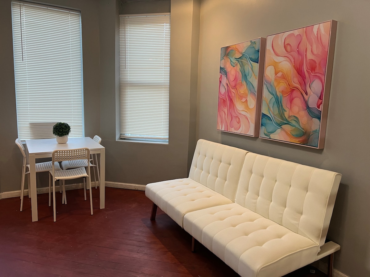 Explore Pilsen and the beautiful City of Chicago in this unique Loft Style Studio apartment with a view of the Willis Tower and in the Heat of Pilsen. Apartment features a Roku TV with Wifi, private entrance, open layout, closet, bathtub with handheld shower head. 1 queen bed and a sofa bed couch, no kitchen but does have a fridge. Unit is on the 4th floor, no elevator. No Private Parking, just street parking . Located near major transportation, Divvy Bike Station across the street.