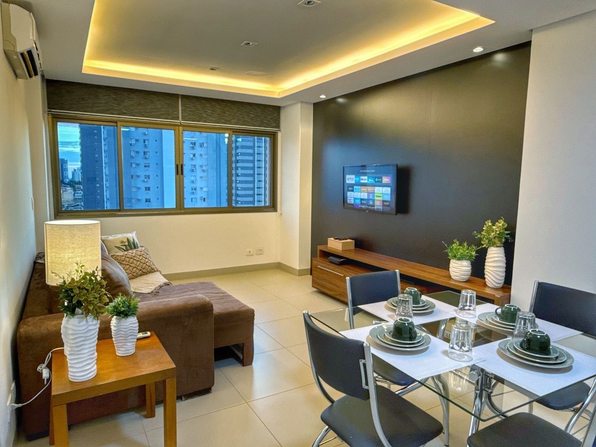 Estúdio moderno no Jardim dos Estados, com vista panorâmica e estrutura completa. Acomoda até 4 pessoas (cama queen + sofá-cama), tem ar-condicionado, Wi-Fi 300mbps, cozinha equipada, duas Smart TVs e garagem coberta privativa. No prédio: piscina aquecida, piscina com borda infinita, sauna seca, academia, coworking, salão de jogos e lavanderia (uso pago). Portaria 24h, elevador panorâmico e muito conforto em uma das melhores localizações da cidade.
