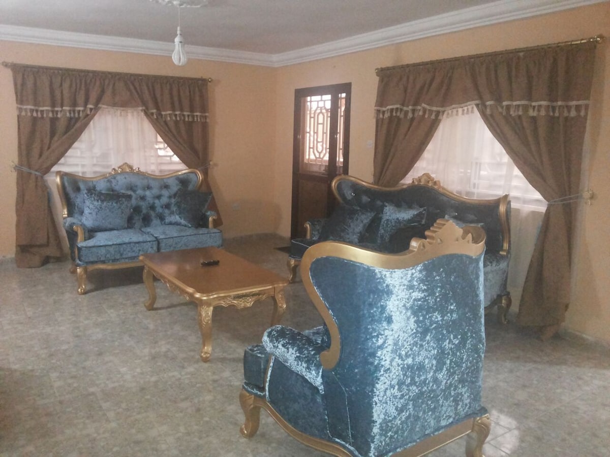 Room $50 per room a night 200 per floor Quiet Neighborhood, large king sized bedrooms with AC and hot water in each bedroom. Each room has separate bathrooms. Large living room and dining area on each floor . TV and Free WiFi. Gym equipments . At your request and cost Private cook and nanny , car rental , airport pick up and drop off, in home hair braiding , make up , manicure and pedicure.