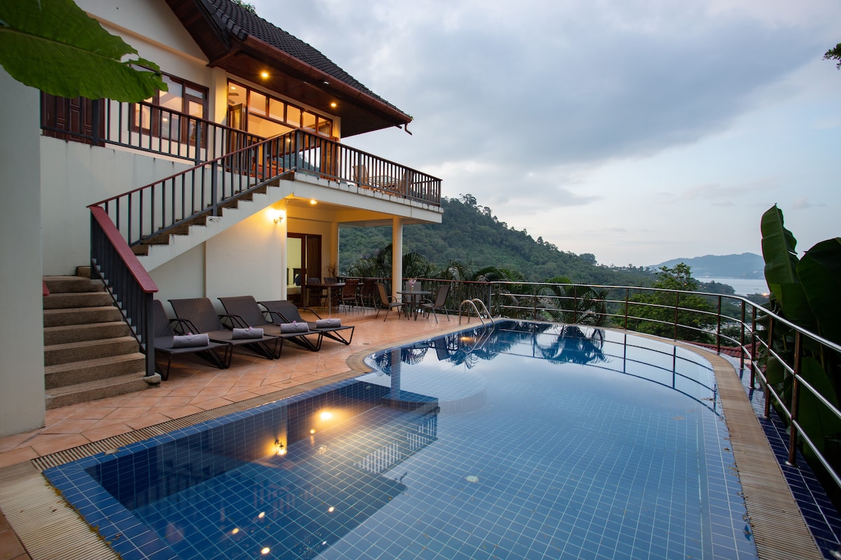 Magnificent, luxurious Thai-style Villa perched on a mountain tranquil estate overlooking Surin and Bang Tao beaches on Phuket's beautiful west coast. Villa of 400m2 interior, 4 bedrooms with King-sized beds, en suite bathrooms. Fully furnished and decorated with Asian Art pieces. Infinity-edge pool is 14 x 5 meter with 2 Thai Salas on each side for outdoor relaxing and breathtaking views. Surin Beach is only 10 minutes walk from the villa. Included Breakfast and Two way Airport Transfers.