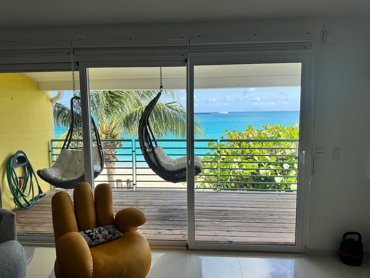 5 star hotel luxury is yours in this modern beach home! 2 guest rooms with en-suite bathrooms and deck access. Enjoy cooking your own meals and dine inside or on the deck (or beach!). Largest deck on Simpson Bay beach has it all: huge daybed, loungers, living and dining areas for your comfort and pleasure. Unwind in the den and enjoy the big screen there or in either bedroom. Your neighbor is a boutique hotel and will gladly serve you meals and drinks right to your deck! Much more info available