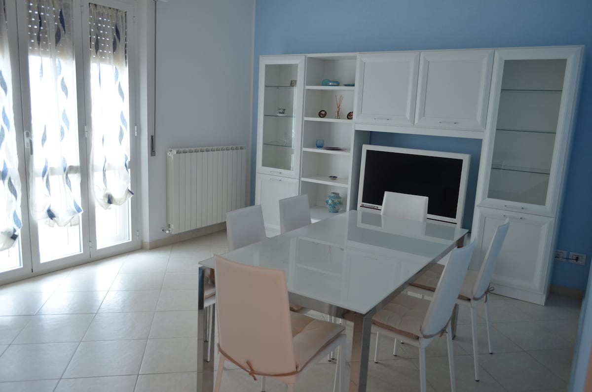 Mini Appartamento bilocale (3 posti letto) a poco più di 1 minuto a piedi dalla Spiaggia. L'appartamento ristrutturato recentemente, è al 4° piano con ascensore. Composto da camera matrimoniale, soggiorno abitabile con divano letto, angolo cottura, bagno con box doccia. Due balconi con vista mare. Panorama a 360 gradi su Baia del Conero, Porto Recanati, Loreto, Appennini. Aria condizionata, tv lcd, cassetta di sicurezza, portone blindato, lavatrice, posto auto riservato coperto gratuito, Wi-fi.