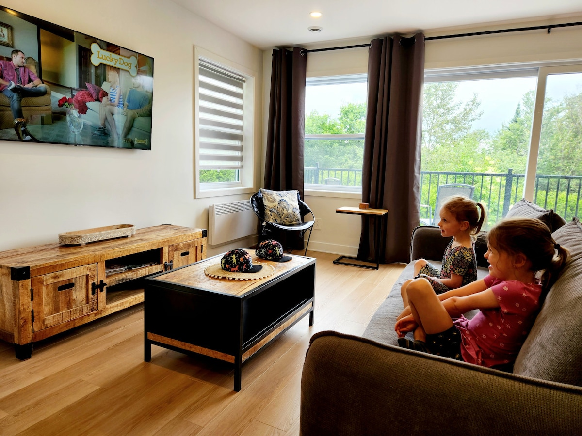 THE DOWNTOWN📍at the heart of everything: ✔ FREE shuttle → Stop outside 🚌 14 min Tremblant Ski Resort🎿 ✔ 11 min Mont-Blanc 🏂🚗 ✔ Remote-work corner 💻 ✔ Equipped kitchen ✔ Smart TV 📺 ❄️ WINTER ● View of illuminated skating rink ⛸️✨ ☀️SUMMER ● Semi-Private Rooftop terrace = views 🌇 ● Public square: Market 🥕 Water Play 🤸♀️💧 Live Shows 🎶 ● Wall A/C in living room + fans in bedrooms ❄️ ● 3 min Bike & BMX park 🚴♂️ ● 5–10 min Golf (Maître, Bête, Géant) ⛳ ● 12 min Mercier Beach 🌊