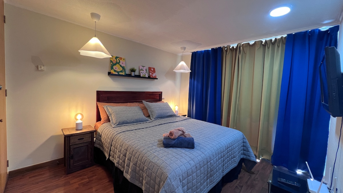 Studio, modern design, ThermoPanel for acoustic and thermal insulation, A/C. Located in the top-rated area in Santiago. Steps away from Tobalaba Metro station, from best restaurants in Santiago, from Costanera Center Mall, cafes and a supermarket. Excellent wifi, free of gas appliances, Cable TV, Smart TV 55" curved screen, nice bathroom. All in a safe neighborhood with many services. For security reasons, it is required to send us, after booking, photos of ID and selfie of each guest.