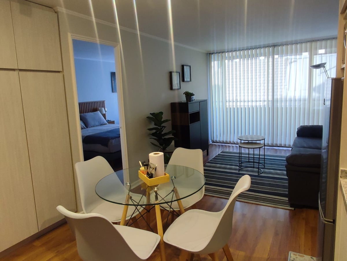 Hermoso Apartamento con Terraza ubicado en el corazón de Providencia, cuenta con Aire acondicionado, calefacción, cocina equipada, Smart TV, WiFi, ropa de cama, toallas, Jabón líquido y un pequeño escritorio pensado en un espacio para laborar nuestros ejecutivos. El edificio cuenta con Gimnasio y conserjería 24 horas al dia. Estamos ubicados frente al Mall Vivo Imperio en el corazón de Providencia.