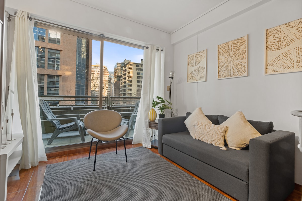 Comodo mini depto en un barrio residencial muy tranquilo con muchas áreas verdes a su alrededor, a 400 mts del cerro San Cristóbal . Además está muy cerca del principal centro comercial de santiago , av providencia, mall costanera center, a 400 mts de Metro los leones . Tiene wifi , tv por cable , smart tv , cocina, Horno, refrigerador , termoeléctrico para el agua caliente , aire acondicionado (frio y caliente). Entrada con dos llaves y al depto con clave . Los esperamos felices