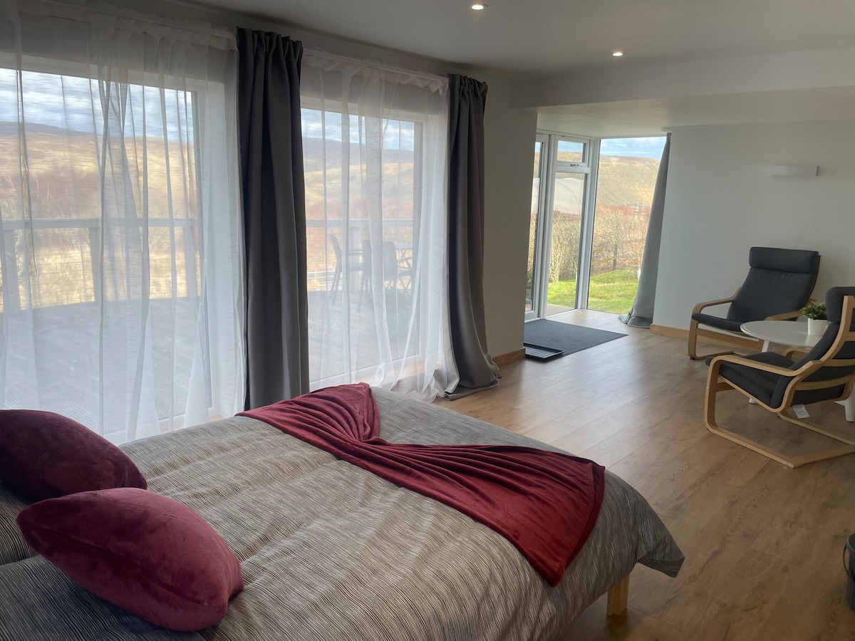 Cnoc hol family suite is a 2 bedroom self contained apartment with your own private entrance. There is a Garden area for your use to the front of the property and parking. There is no kitchen but we provide a continental breakfast pack. Wi-Fi and smart TVs in each bedroom. Beautiful views in a nice quiet area. We are 3 miles from Uig where there are shops, restaurants, Cafes & Takeaways and the Uig ferry terminal for going to the outer isle. We are 15 miles from portree which is a busy town