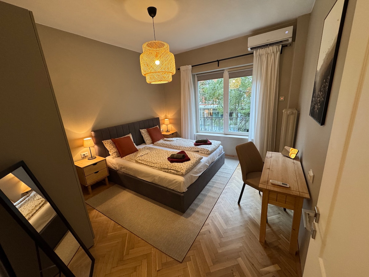 Stay in the heart of Sofia! This spacious 2BR apartment is just steps from cafés, shops, and landmarks. Enjoy a bright lounge with a leather sofa, ultra-fast WiFi, and Smart TVs with Netflix in every room. Rest easy in the king-size bed , cook in the fully equipped kitchen with a coffee machine, and refresh in a bathroom stocked with toiletries and fresh towels. A washer-dryer combo adds extra convenience. With public transport right at your doorstep, this is the perfect base to explore Sofia!
