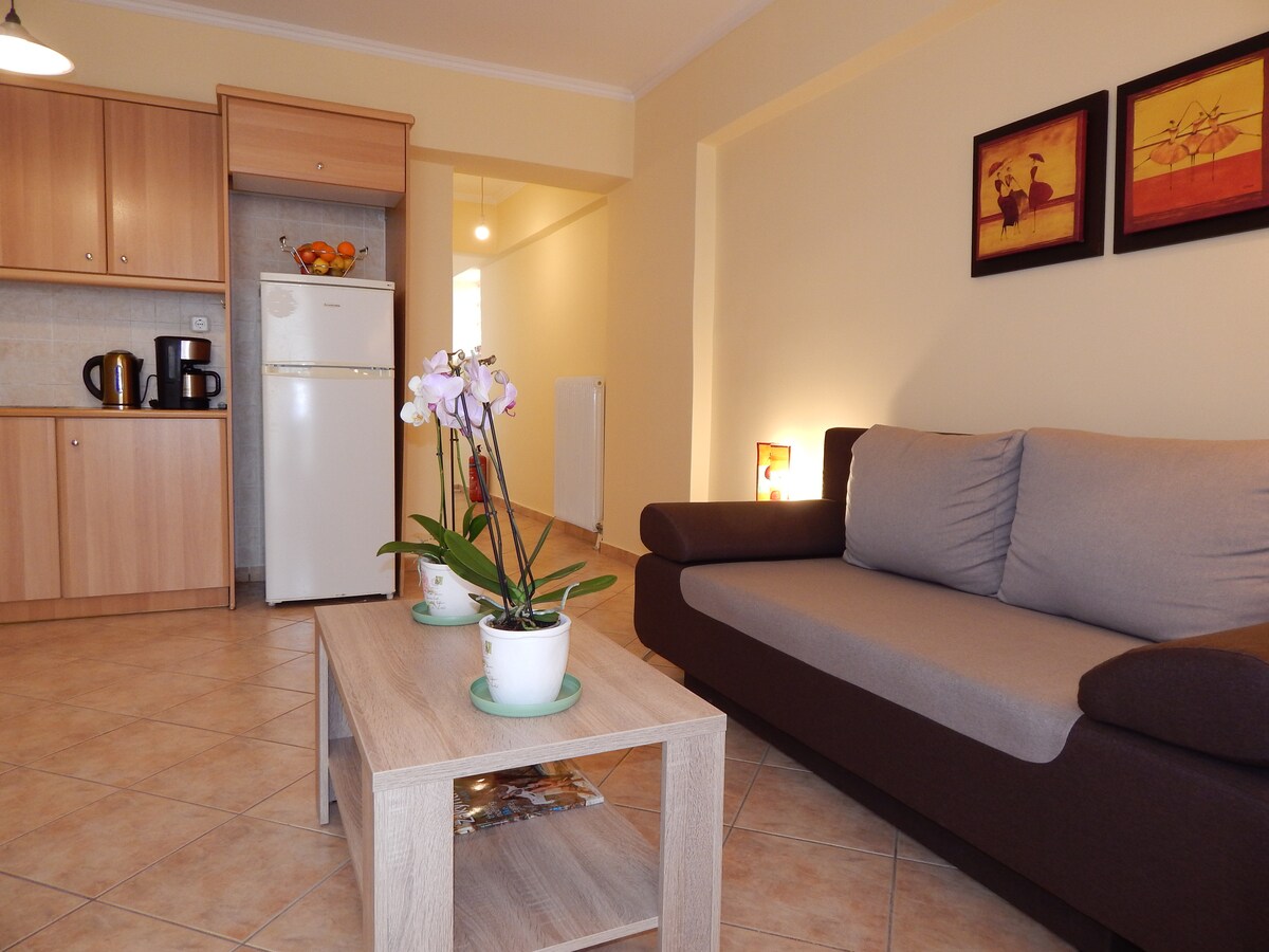 A first floor apartment recently renovated in the heart of the town of Zakynthos.Just 1min walk from central squares of St. Markos and of D.Solomos , in a quite street, yet next to all amenities. The apartment has one bedroom with a double bed,a second bedroom with a sofa bed, fully equipped kitchen, bathroom, smart tv, a/c.The organised beach of Krioneri (Plaz EOT)is only 5min away on foot.You will love our apartment because of the neighborhood!