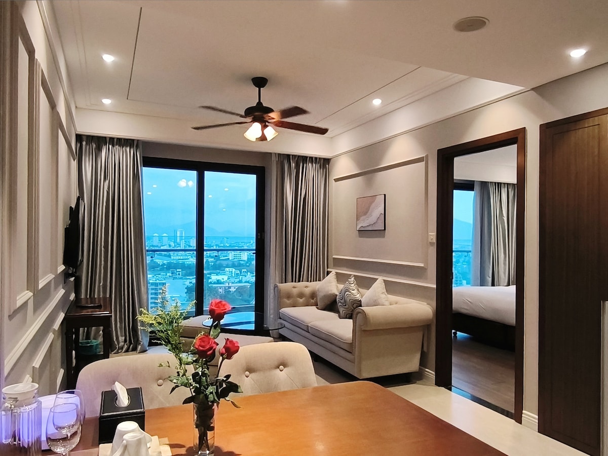 Indulge in panoramic coastal beauty from this rare high-floor corner suite at Fusion Suites Da Nang — where sweeping sea views on two sides meet refined interiors and elevated 4-star comfort. – Just 1 minute to the pristine sands of My Khe Beach – Corner position framing dual-aspect ocean panoramas – Stylish layout designed for both relaxation and inspiration – Full kitchen and premium amenities for a seamless stay POOL USE UPON REQUEST – PLEASE MESSAGE US.