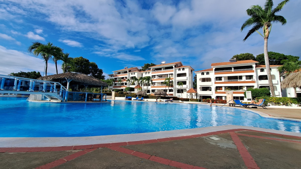 Welcome to this striking and tropical apartment, an ideal escape from the hustle and bustle of everyday life. Enjoy a picturesque view of the pool and stunning outdoor surroundings within the complex. Our tropical Oasis boasts two pools, and an on-site bar, and restaurant. The beach is just a short 10-minute stroll away. Nestled in the heart of Sosua, you'll find an abundance of dining and entertainment options nearby."