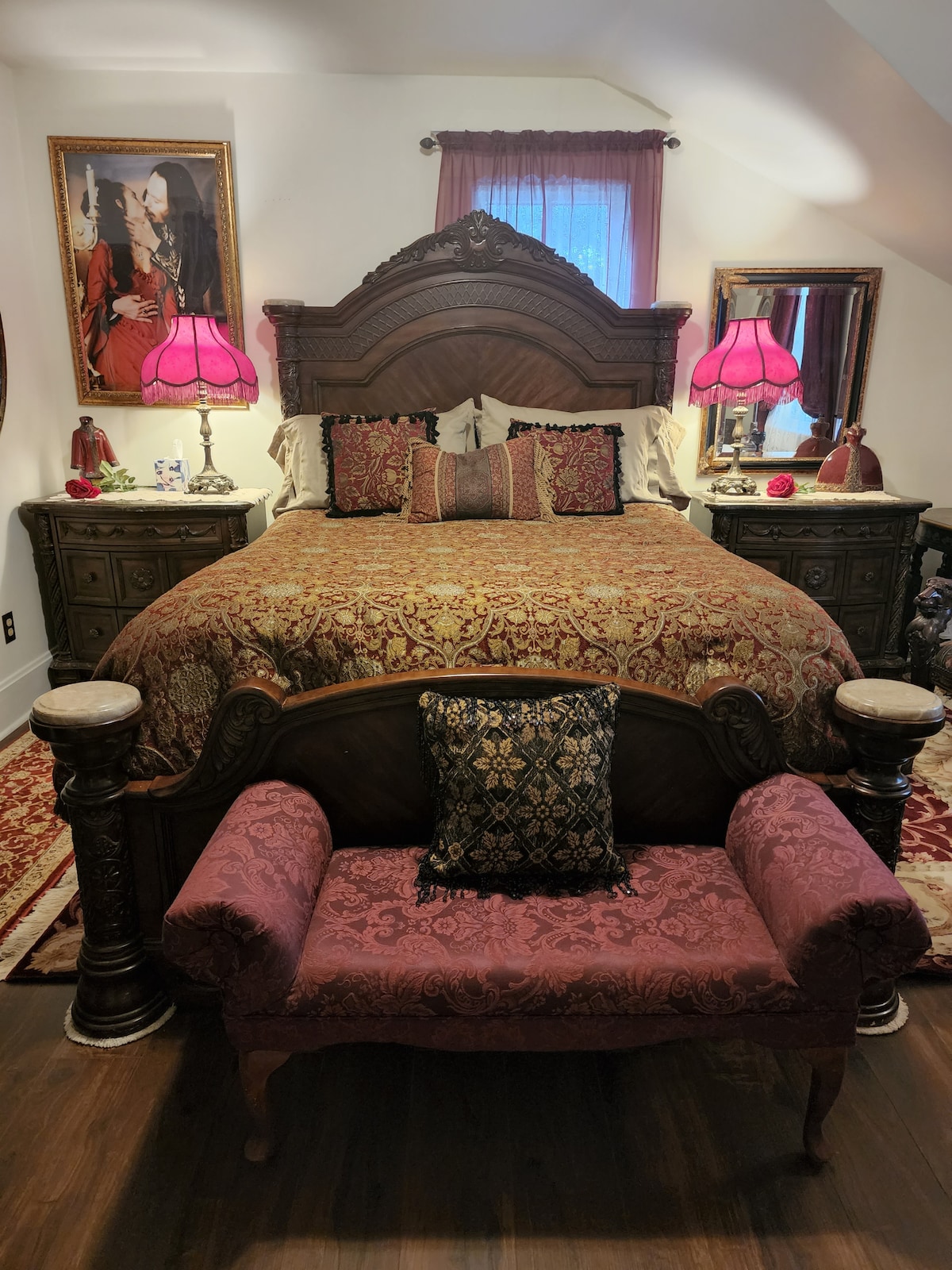 You won’t want to leave this charming, one-of-a-kind place. The Farmhouse was built in 1900 and has the Old world charm with the amenities of today. Mina's room has dark mahogany furniture, burgandy colors, and even an electric fireplace. We do have internet for our guests. In the morning you will awake to coffee made and a light breakfast included in your stay. The parlor sitting room is available and the porch is a favorite hangout for our guests! Quiet and peaceful! ESCAPE TO THE FARMHOUSE
