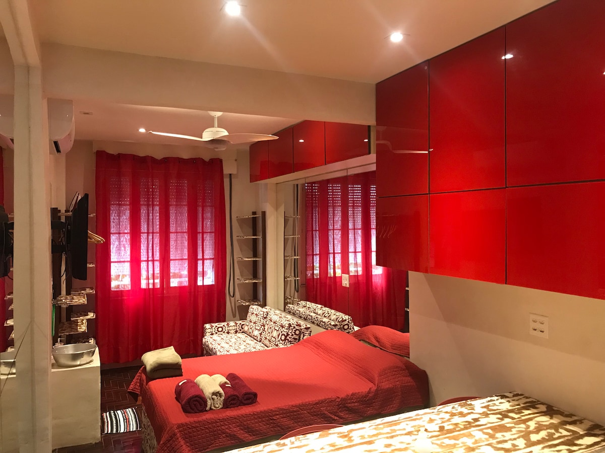 Renovated and elegantly furnished apartment; quiet backyard 1 block from Copacabana beach (Posto 5), 2 air conditioners, electronic locks, 24-hour doorman. Plenty of shops available such as grocery stores, pharmacies, supermarkets, restaurants, gym, banks all located less than 2 blocks away. Apartment located 15 min away from Ipanema and Lagoa (walking on foot). It has 1 double bed (bedroom) and 1 sofa bed (living room) big and comfortable.
