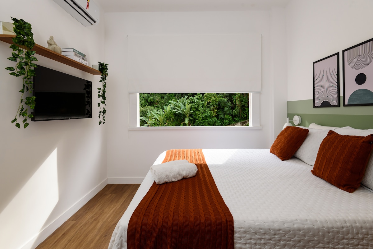 Romantic loft between Santa Teresa and Laranjeiras with panoramic views of Guanabara Bay, Sugarloaf Mountain, and Christ the Redeemer. Designed by us, architects and designers, it combines handmade furniture, art, and reclaimed wood. Perfect for couples, photo shoots, or special celebrations, offering charm, privacy, and easy access to Rio’s main attractions.