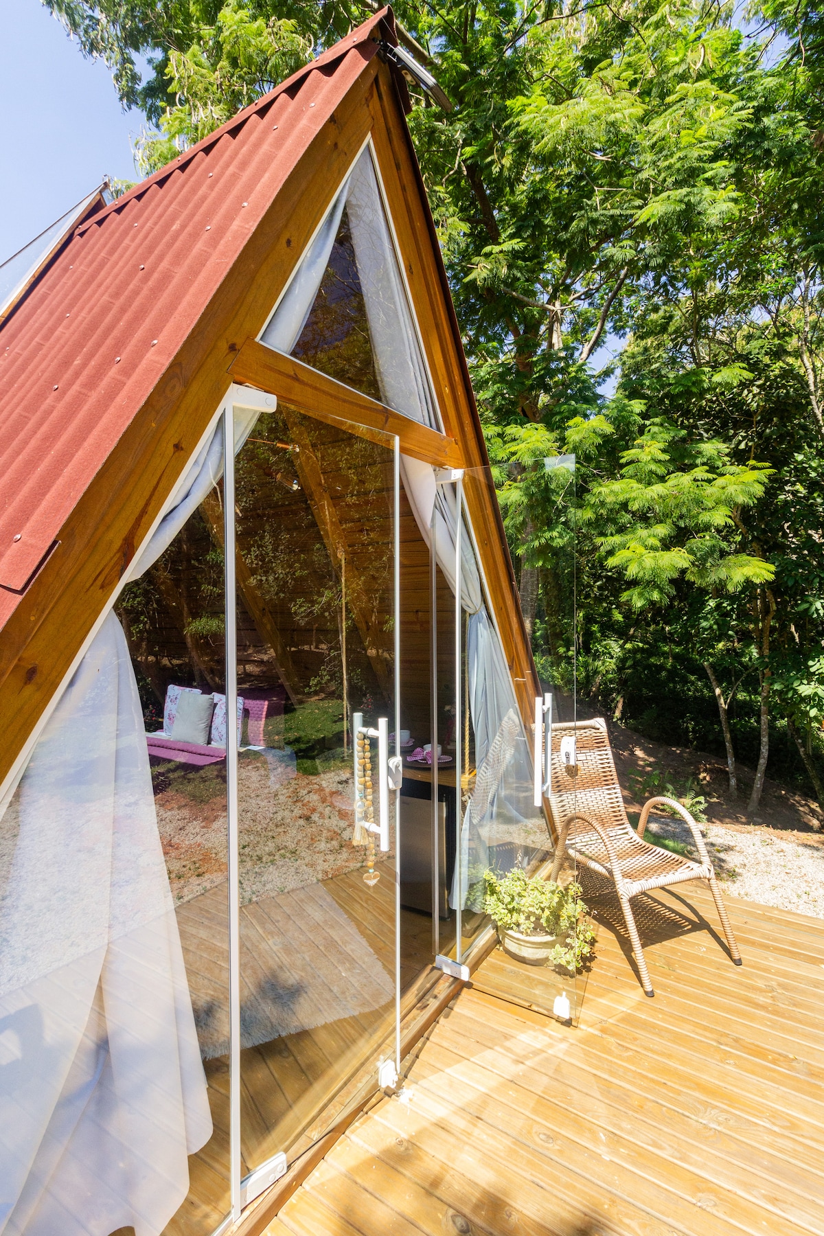 Discover "Mirante da Coruja", a tranquil refuge amidst the treetops, built with reclaimed pinho de riga wood. This glass-walled chalet provides privacy, comfort, and stunning views. Equipped with a fireplace, a private deck, and a spacious terrace, it becomes the perfect backdrop for special celebrations and relaxing moments, combining local art authenticity with the magnificent surrounding nature.