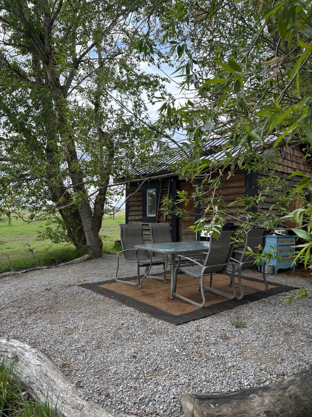 This is a new cabin nestled among huge willows with an amazing view of the Rockies in the distance. There’s a vintage clawfoot tub and shower outside on the deck, and a new compost outhouse tucked behind at the back of the cabin, how cool is that! Inside is a comfy king bed with soft linens, antique table and chairs, microwave, French press coffee maker , toaster and a BBQ outside. There are lots of lovely shade trees and fire pit area for your own picnics.