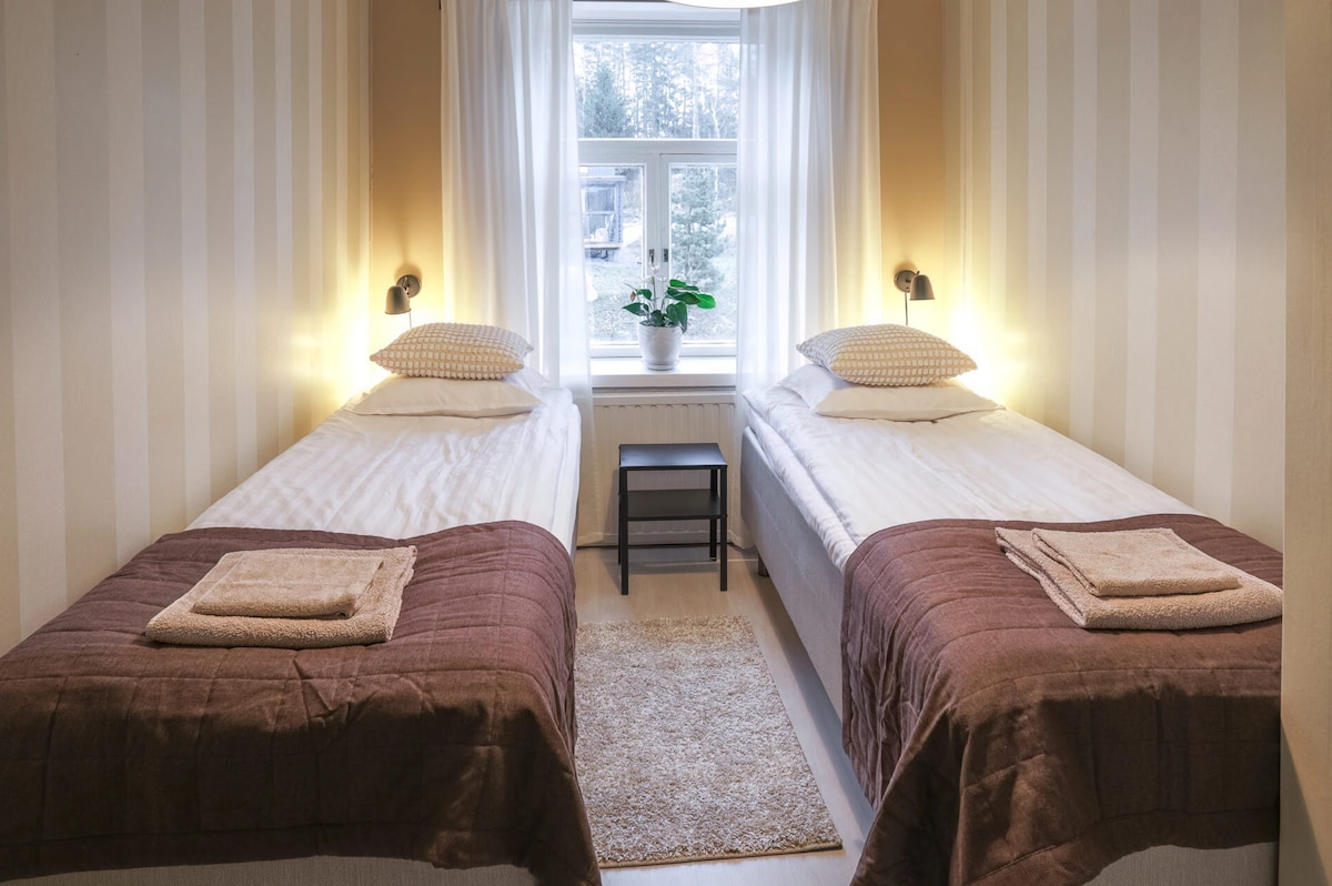 Homelike hotel room with great amenities at Hiisi Hotel Turku Seaport in Turku Harbour. The experience is contactless and the arrival easy. The room features a double bed, 2 single beds and a sofa bed. Work desk and chair and an ensuite bathroom, a flat-screen tv and wifi. All rooms feature a mini-fridge. Linen, towels and final cleaning are included. No breakfast, reception or air-conditioning. Please note rooms areon the 2nd floor and the hotel has no elevator.
