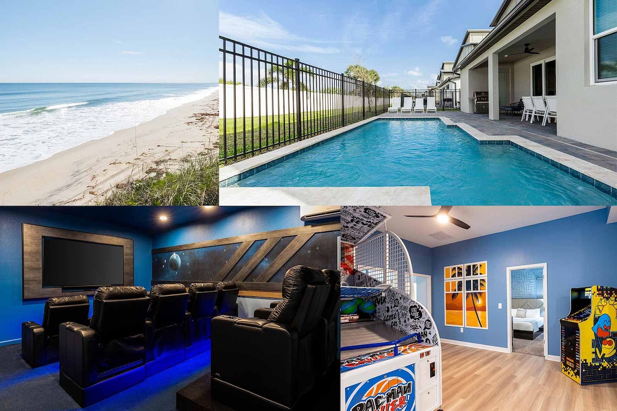 Real life and fantasy converge in the Fanta Sea villa, an oceanfront gem located on the shores of Melbourne Beach, FL—just a short drive to Orlando. Giant glass windows and doors practically transport you outside, where a private pool & patio are mere steps from the sea. Four stunning bedrooms, grand living spaces, and the home theater boast luxe decor—each infused with the warm colors of the sand and sea. Start the day on the coast, and end it on the coasters of Disney World, only ~90 min