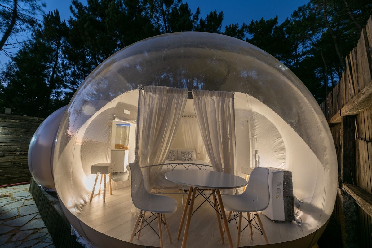 Imagina un rincón mágico en plena naturaleza, donde el cielo estrellado es el techo de tu habitación. Un lugar con suites burbuja, rodeado de montañas, bosques o un paraje natural que invita a la desconexión y el descanso. Las suites burbuja están diseñadas para fusionarse con el entorno sin renunciar al confort. Son esferas transparentes con una cama balinesa, sábanas suaves y una iluminación tenue que crea un ambiente acogedor. Todas las suites incluyen baño privado y jacuzzi exterior.