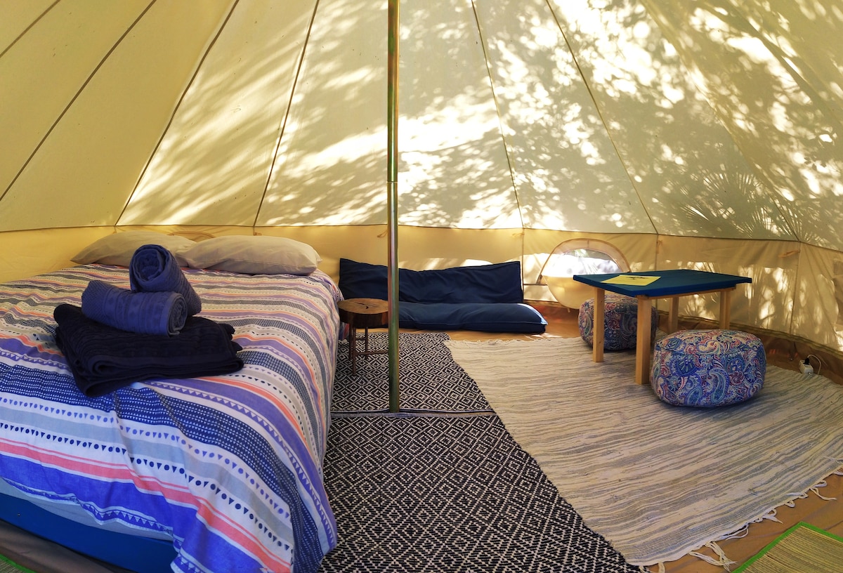 Acogedora Bell Tent, pensada para quienes valoran la tranquilidad y los pequeños detalles. Perfecta para 2 o 3 personas, con cama doble, cama individual y espacio suficiente para descansar cómodamente. Forma parte de un espacio ecológico rodeado de árboles, donde la desconexión está garantizada. En el exterior podrás disfrutar de una zona íntima y privada, donde podrás descansar, tomar un picnic o simplemente relajarte. Baños compartidos y un ambiente pensado para disfrutar sin prisas.