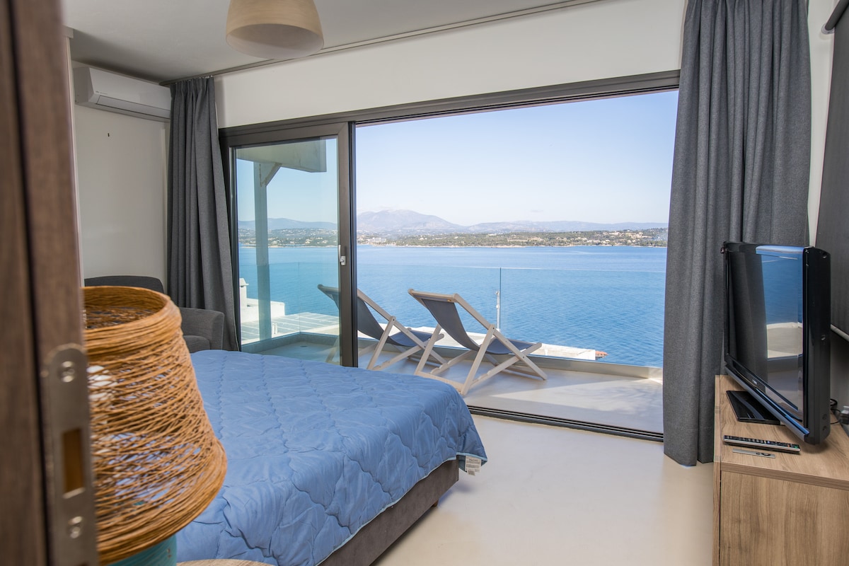 If you have seen “Glass Onion: All knives out”, it’s the villa in the intro of the movie (from 13:00-18:00). Unique location by the sea close to everything: the iconic Poseidonion Hotel, the island centre, two open-air cinemas, the market, restaurants, cafes, bars, beaches,everything in walking distance and with the best views of the sea and beautiful sunsets. 4 bedrooms, that sleep 8-10 people, all with their own bathroom, various outdoors terraces, nice spacious bright kitchen.