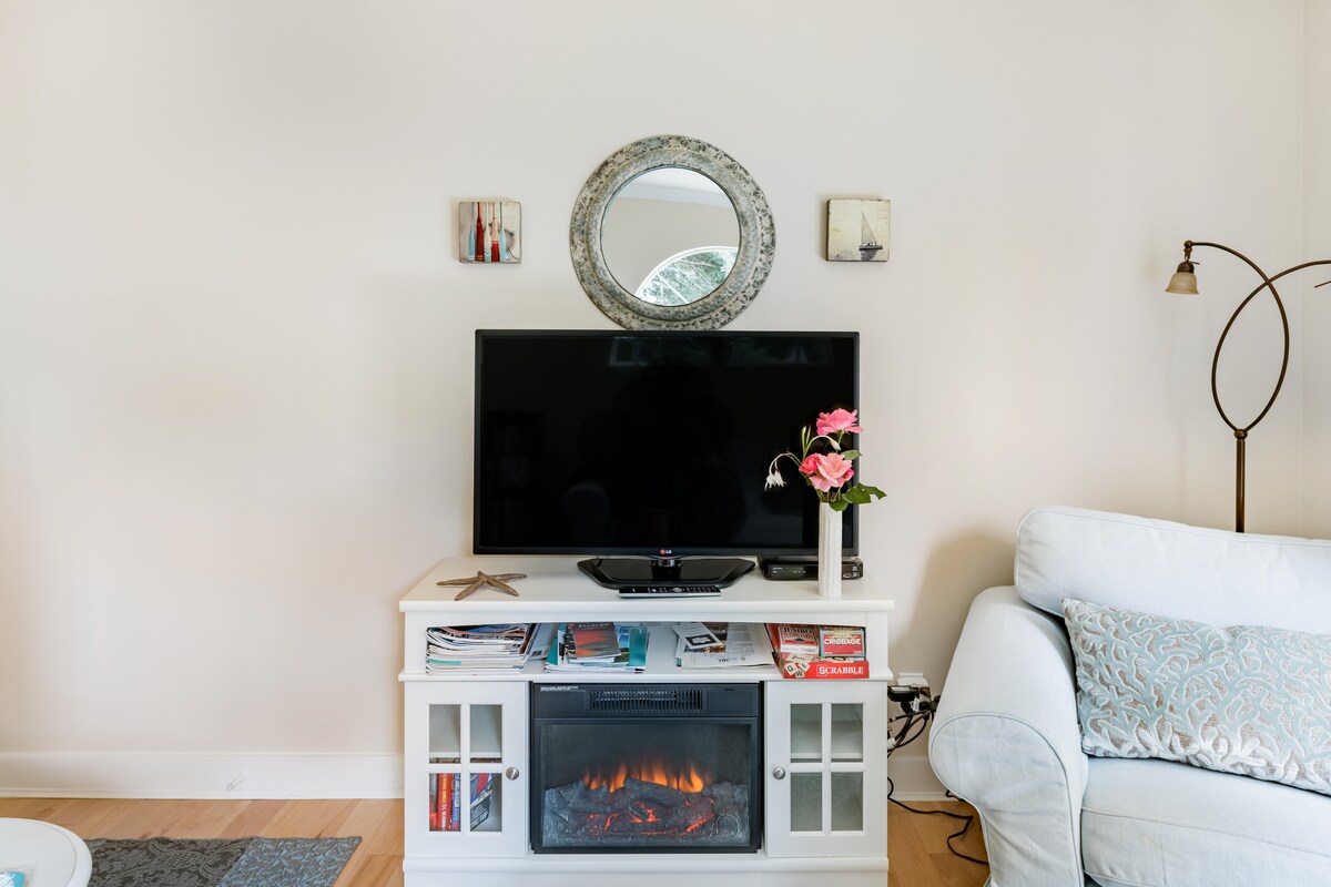Oceanfront with stunning views of Howe Sound/Coastal Mountains (above photo). Close to town, ferry, restaurants. A 10 minute walk through our forest leads to our swimmable beach. Suite is newly renovated with stone fireplace insert, queen bed, new sofa bed, keyless entrance and private deck (bedding and towels provided). Kitchenette has microwave, small fridge, infra-red single burner, water dispenser, coffee/espresso makers, dishes, no sink (we do the dishes for you). BL#00000625
