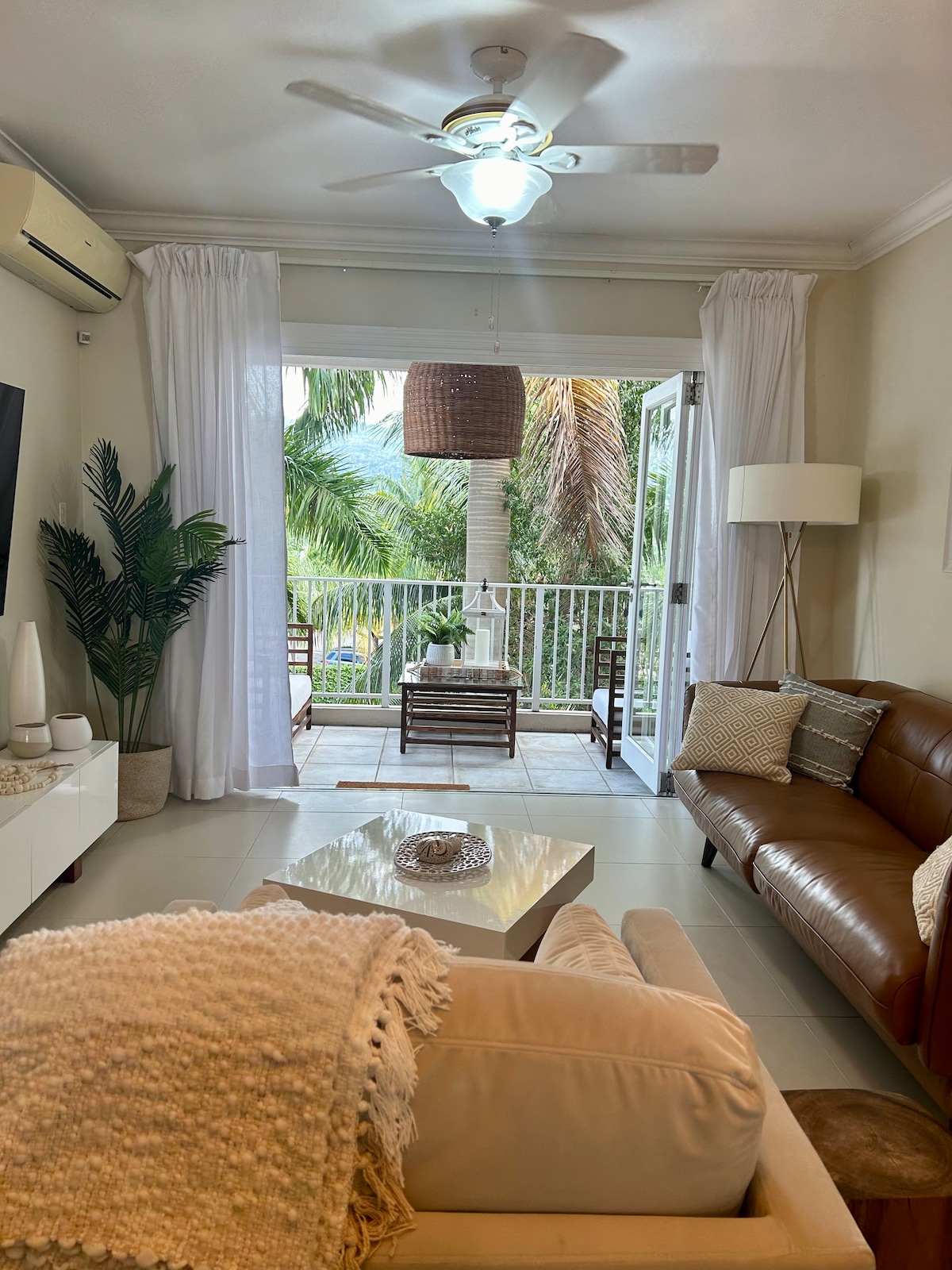 This charming villa room has high ceilings, oversized hand crafted windows, custom double doors and a covered screened porch which adds a comfortable living area great for remote work or just observing the doctor bird floating from flower to flower. The plush queen bed and newly renovated en suite bathroom make this cozy space a dreamy beachside home. This cottage is fan cooled with Hot water shower. Ideal for weekends away or a solo traveler.