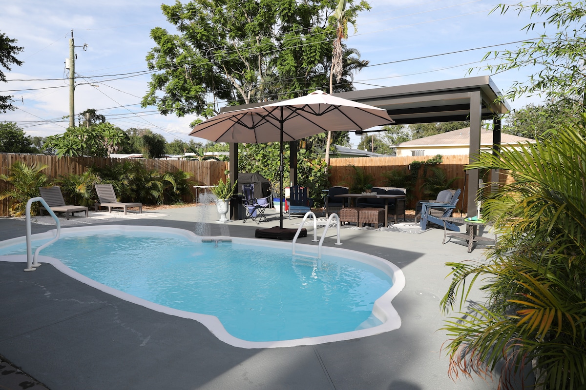 Kick back and relax in this calm, stylish beach-vibin home. The 2 bedroom plus queen size sleeper sofa in sunroom is the perfect spot to get away and never have to leave. Enjoy your morning coffee or afternoon cocktail lounging by the fire pit. Light up the grill and cook your meal while you enjoy a pool heated to 86 degrees for free! Wifi and 3 streaming TV's. If you want to get out and explore, you are only 6 minutes from the award winning beaches and 25 minutes from downtown St Pete.