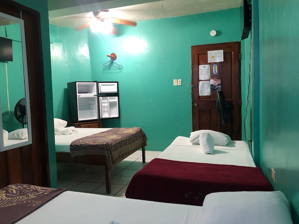 This spacious and inviting room sleeps up to 5 guests, making it the perfect choice for families or small groups seeking comfort and convenience. Enjoy cozy beds, a private bathroom with hot and cold water, free Wi-Fi, and cable TV—all refreshed daily with housekeeping. Relax on the rooftop terrace, unwind in the garden courtyard, or gather in the shared lounge after a day of exploring Dangriga.