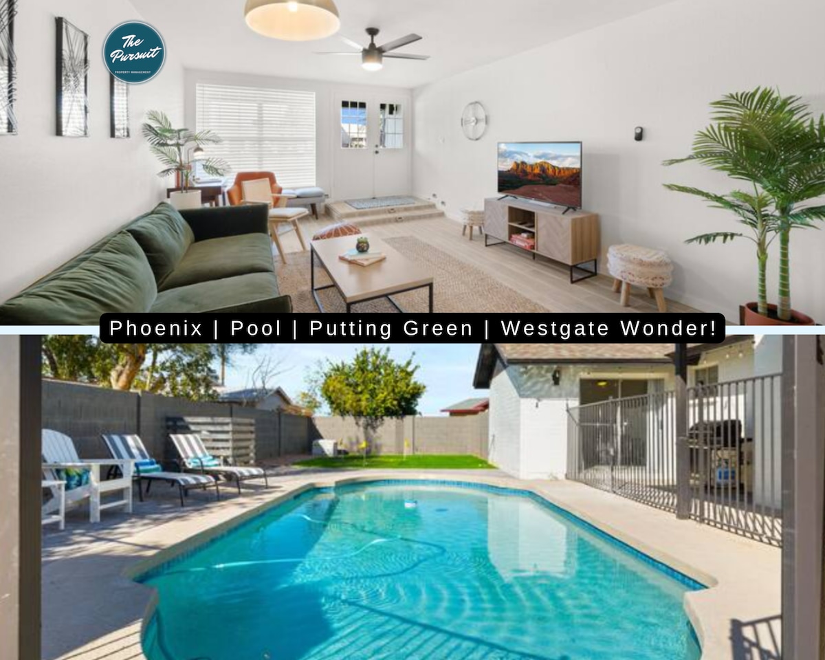 Discover comfort in this fully updated 3-bedroom, 2.5-bath home, nestled in a secure gated community. The home boasts a warm and inviting atmosphere, premium finishes, televisions and the fastest internet. Step outside and enjoy the pool right across the street. This home places you at the heart of the action—less than a mile from State Farm Stadium, the Entertainment District, Desert Diamond Arena and Casino. Whether you're here for a game, a concert, spring training or just a weekend getaway.