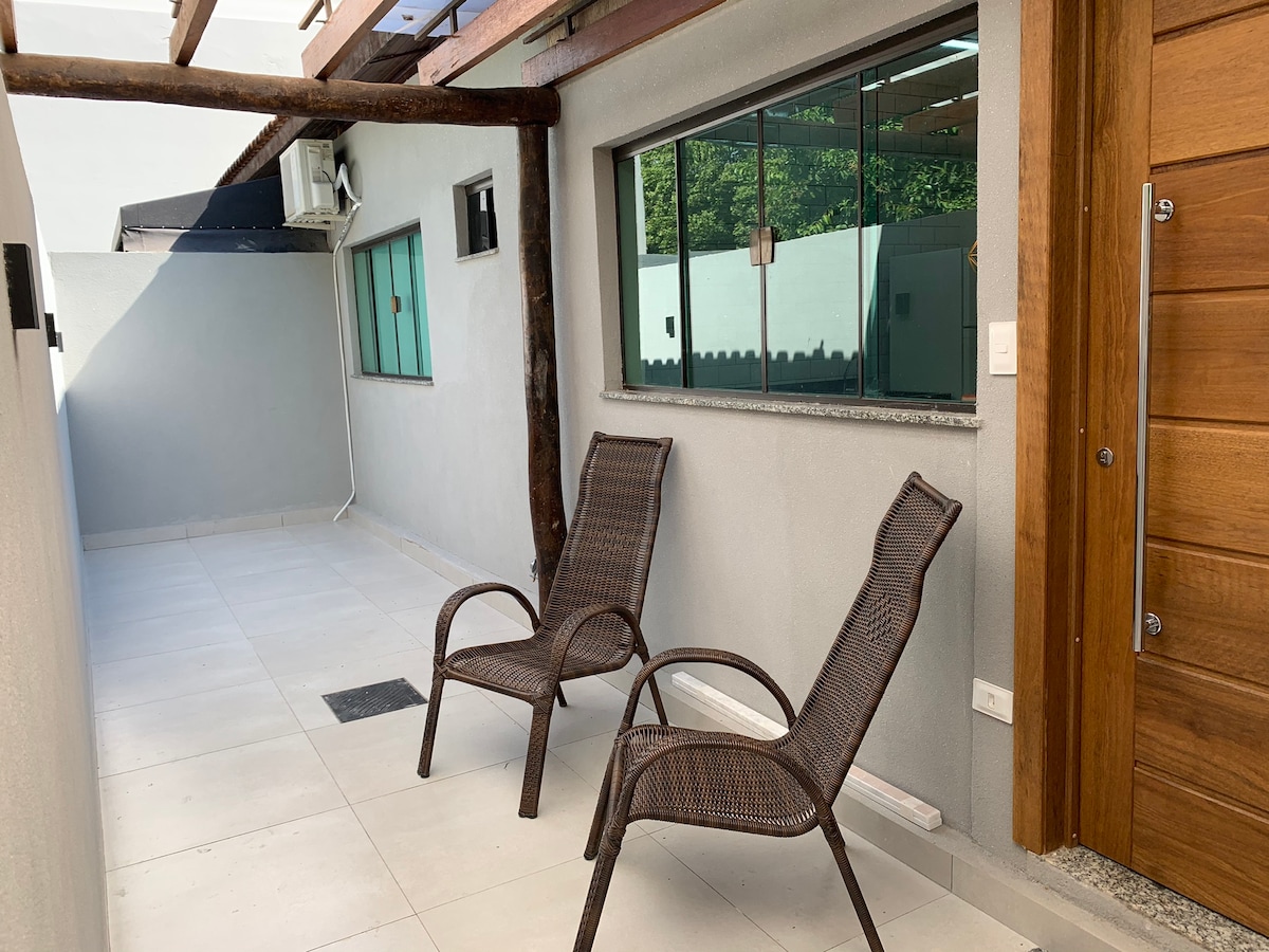 Casa em condomínio à 5 quadras do centro de Bonito. Além dos quartos com ar condicionado, possui um banheiro e uma sala-cozinha com sofá-cama, mesa, TV e ventiladores de teto. A cozinha possui fogão, geladeira, microondas, forninho elétrico, cafeteira e demais utensílios. Dispõe de Wi-Fi, opção de rede de deitar junto a entrada da casa, além de vaga de garagem. Possui ainda lavanderia com tanque e máquina de lavar roupas, junto a quintal privativo com churrasqueira portátil e bancos ao ar livre.