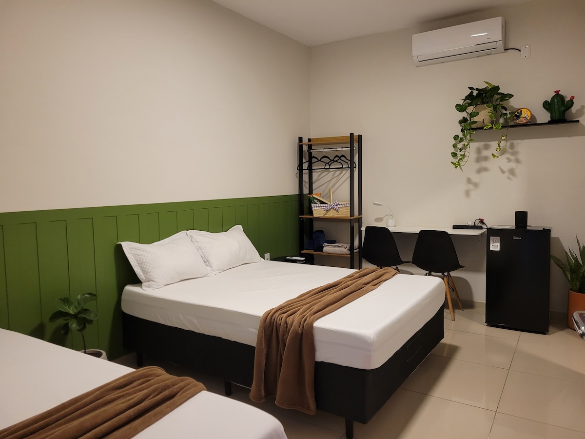 Nossa suíte conta com ar condicionado, uma cama de casal, banheiro privativo e uma pequena área de estar. A decoração é moderna e acolhedora, com toques de natureza que fazem você se sentir em casa. Desfrute de um café da manhã no jardim decorado, rodeado por árvores e flores que criam um ambiente sereno.