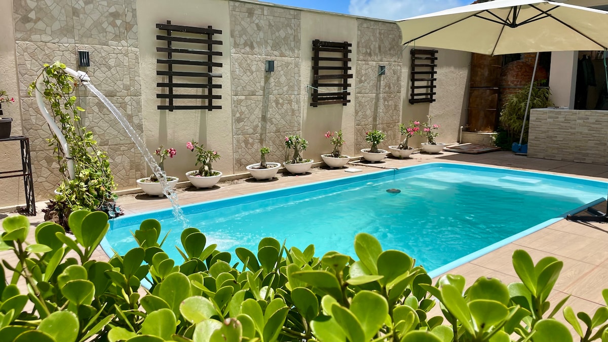 Relaxe neste espaço calmo, cheio de estilo. Tranquilo, seguro e confortável. Um jardim lindo. 2 suites com ar, uma cama de casal Queen e 2 de solteiro. Garagem, piscina, jardim maravilhoso abraçando todo o espaço. Cozinha equipada e varanda estilo sala vazada conjugada. Rede para relaxar, sofá três lugares duas poltronas aconchegantes, uma poltrona com apoio de pé uma mesa pequena com 4 cadeiras, uma mesa grande de mármore, espaço de trabalho. Boa iluminação e muito estilo.