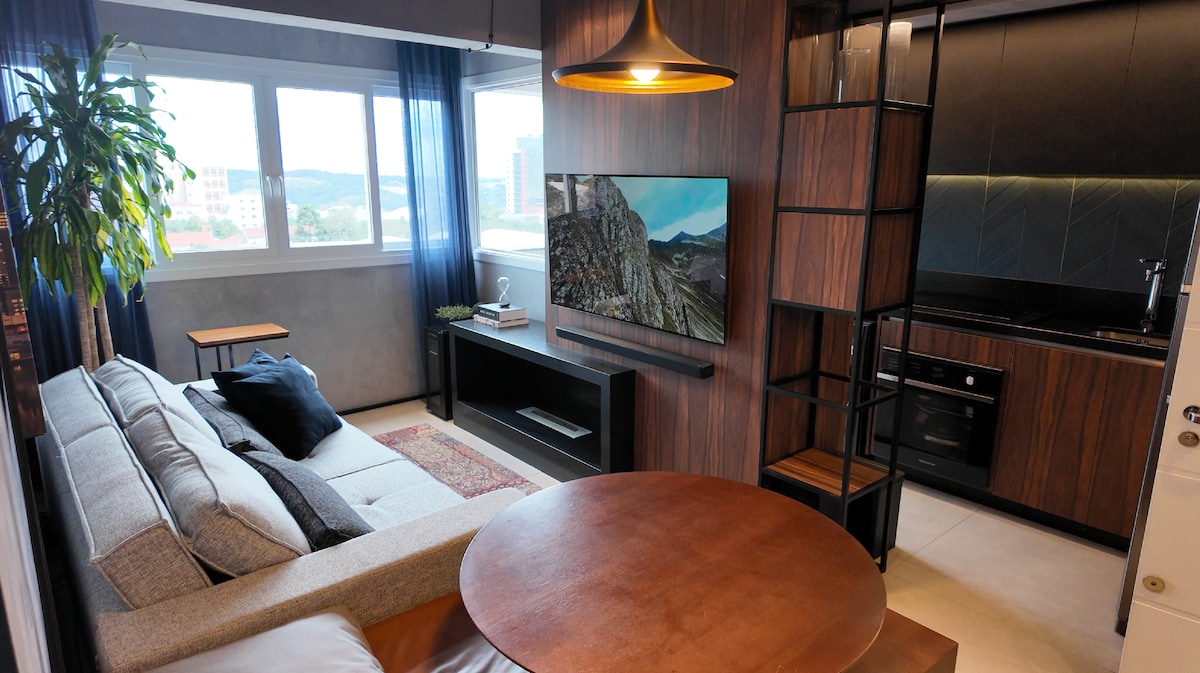 Viva uma experiência única neste estúdio acolhedor e elegante, projetado com atenção aos detalhes para oferecer conforto, funcionalidade e muito estilo. O ap azul planejado é um diferencial exclusivo, com iluminação suave e decoração pensada para relaxar, móvel inteligente e versátil que se transforma em mesa de jantar ou apoio para cozinhar — perfeito para quem valoriza funcionalidade. Piano digital disponível para relaxar, praticar ou se inspirar. Smart TV, Wi-Fi.