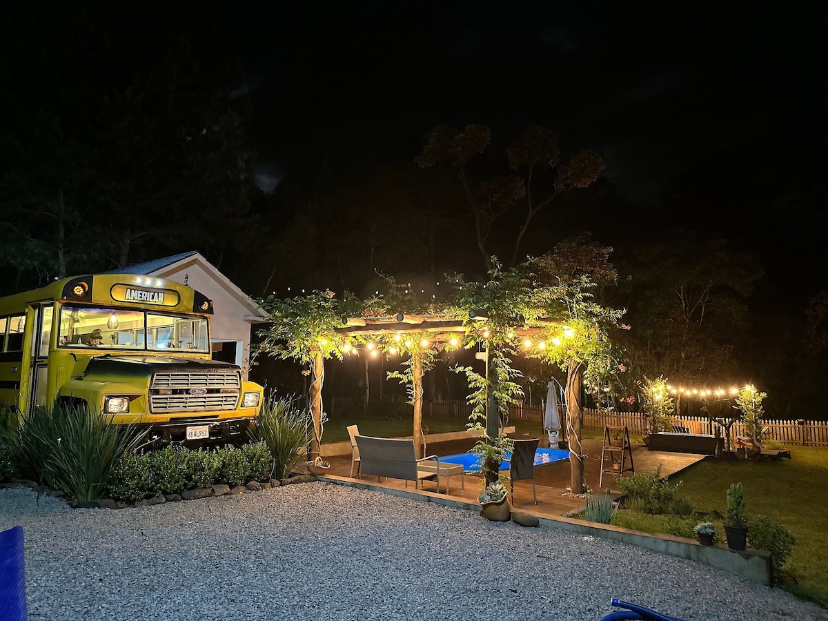 Multitemporada presents American Bus Glamping - Capinzal/SC. A school bus converted into a cabin offers comfort and adventure, with a heated pool, hot tub, fire pit and a peaceful river. Enjoy the trail to the waterfall and a full kitchen – or home-cooked meals prepared by partners. The perfect getaway to relax and live unforgettable moments!