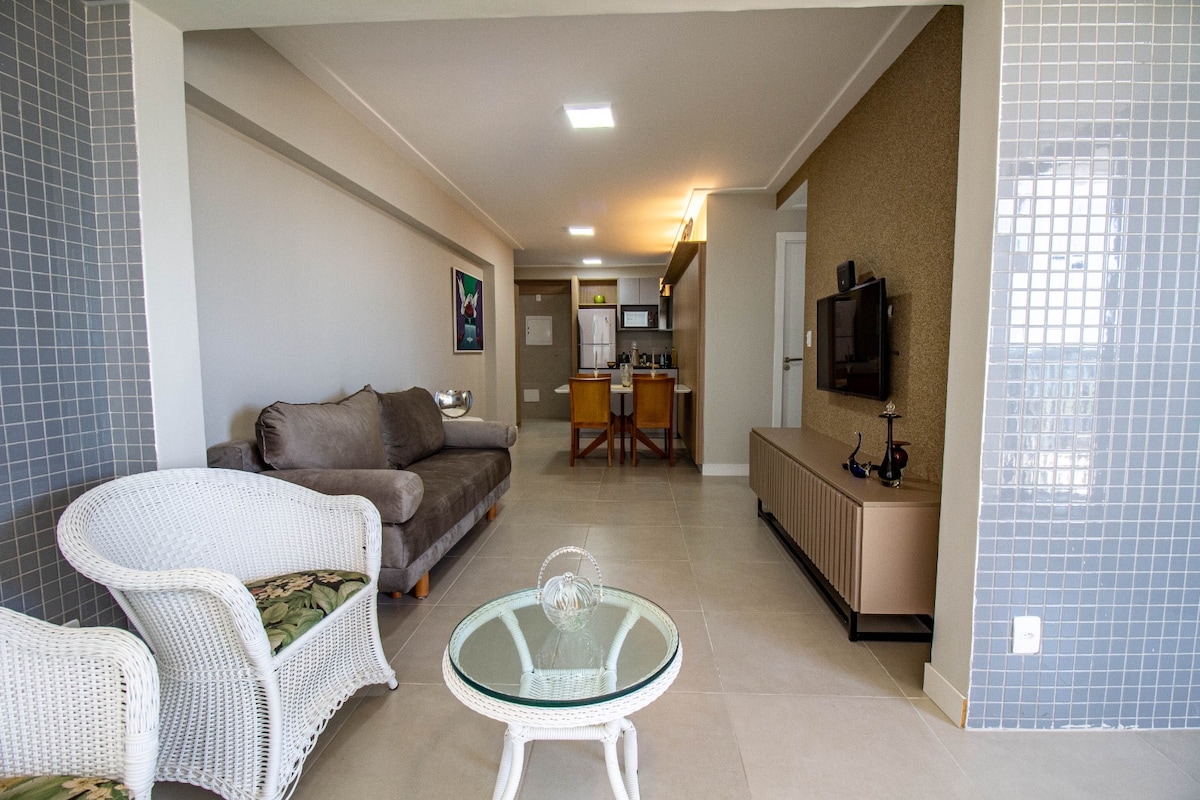 Se você busca um espaço moderno, seguro, confortável e com uma vista mar apaixonante, seja bem-vindo! Apartamento quarto e sala com excelente estrutura de lazer, a 200m da praia! O prédio é super novo e conta piscina de borda infinita, rooftop com vista panorâmica, academia, brinquedoteca, coworking, segurança 24h, 1 vaga de garagem. Oferecemos roupas de cama e banho, wi-fi, utensilios de cozinha e toda a experiência de uma Super Host! Não cobramos energia.