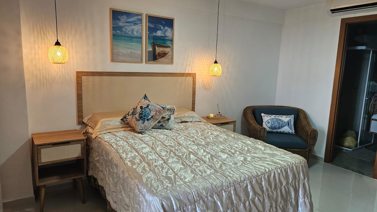Para pessoas exigentes! Desfrute de momentos inesquecíveis no "Paradise View", em Salvador. Apartamento novíssimo, vista mar espetacular, varandão com cervejeira, decoração tropical, Smart TV 55, ar condicionados, Wi-Fi 500Mb e cozinha completa. Acomoda 4 pessoas (6 com taxa adicional) com 2 camas de casal e 1 bicama. Edifício com piscina infinita, rooftop, academia, pub, coworking, churrasqueiras, portaria 24h e garagem coberta. Localização perfeita, na praia e a 10 min do aeroporto.