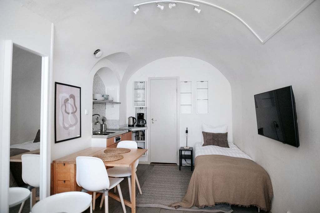 This renovated 21 SQM single studio is located in between the Old Town and the vibrant district of Södermalm. The apartment offers free Wi-Fi, a flat-screen cable TV and a fully equipped kitchenette. You live just a minute from restaurants, shops and public transport. The apartment are located in a building from the 1650s. The apartment have high ceiling and stucco. There is also a dining table and a modern bathroom with a shower.