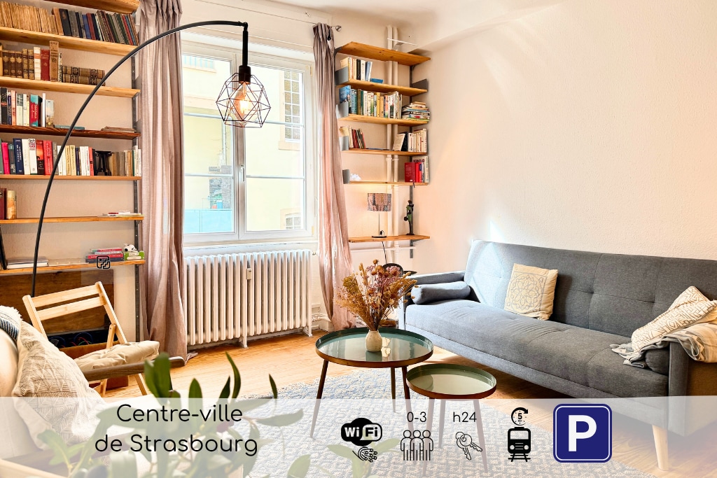 Charmant deux pièces de 55 m2 situé dans le centre historique de Strasbourg, à 50 mètres de la place de la Cathédrale. Logement classé 3 étoiles. Grand salon avec canapé convertible, cuisine ouverte entièrement équipée, grande chambre avec placards intégrés, poutres apparentes. Au 4è étage avec ascenseur, l'appartement est placé entre le Parking Gutenberg (100 m) et la rue des Orfèvres, nombreux commerces et restaurants à proximité immédiate. Parking gratuit à 15 minutes a pied de l appartement