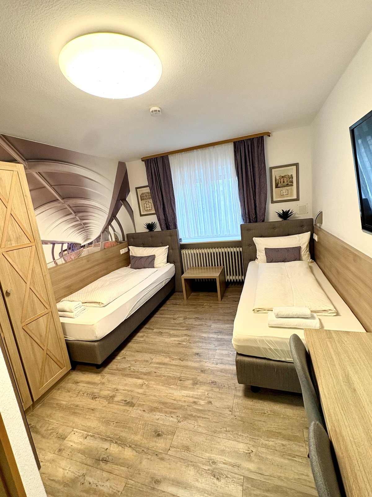 Schönes Doppelzimmer inklusivhe reichhaltigem Frühstücksbuffet. Alle unsere Zimmer verfügen über Sat- TV sowie ein privates Bad mit Dusche, WC, Kosmetikspiegel und Haarfön entsprechend der aktuellen Sterne- Klassivizierung über den Deutschen Hotel- und Gaststättenverband DEHOGA. Unsere Doppelzimmer der Kat. A befinden sich alle direkt im Hotel, nicht in unserem Gästehaus.<br>