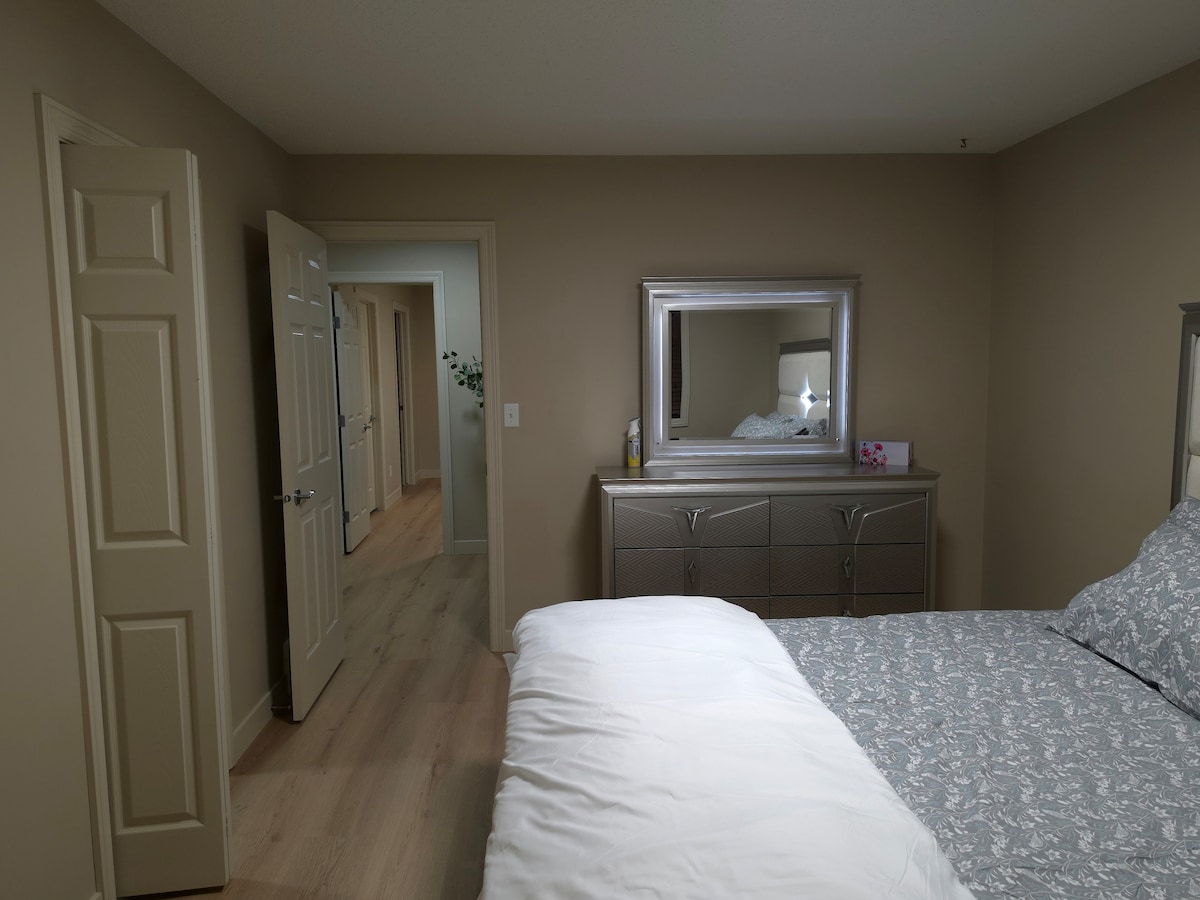 舒适的1卧室Bsmt套房,配备加大双人床、无线网络和工作区