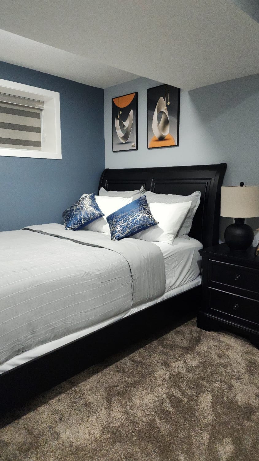This private basement unit offers a perfect blend of modern living, spaciousness and comfort, with a main floor feel. It presents a welcoming atmosphere, perfect for entertaining guests or simply relaxing after a long day. The chef's kitchen boasts sleek stainless steel appliances, making cooking a joy. The bedroom is a cozy retreat with a king-size bed and numerous pillows for your comfort. This location provides easy & quick access to the int'l airport, local amenities, parks and more.