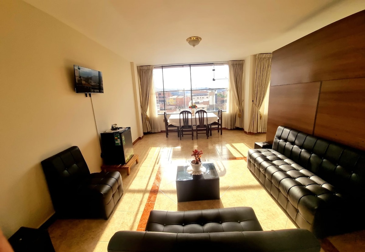 Acogedor y cómodo departamento de una habitación, espacio lleno de luz natural en una zona residencial y tranquila de la ciudad, cerca a supermercados, farmacias y agencias de bancos. Ingresa por un patio común es necesario subir escaleras a un tercer piso, cuenta con una habitación con dos camas, baño y cocina independientes y una terraza. se puede tener garaje sin costo adicional.