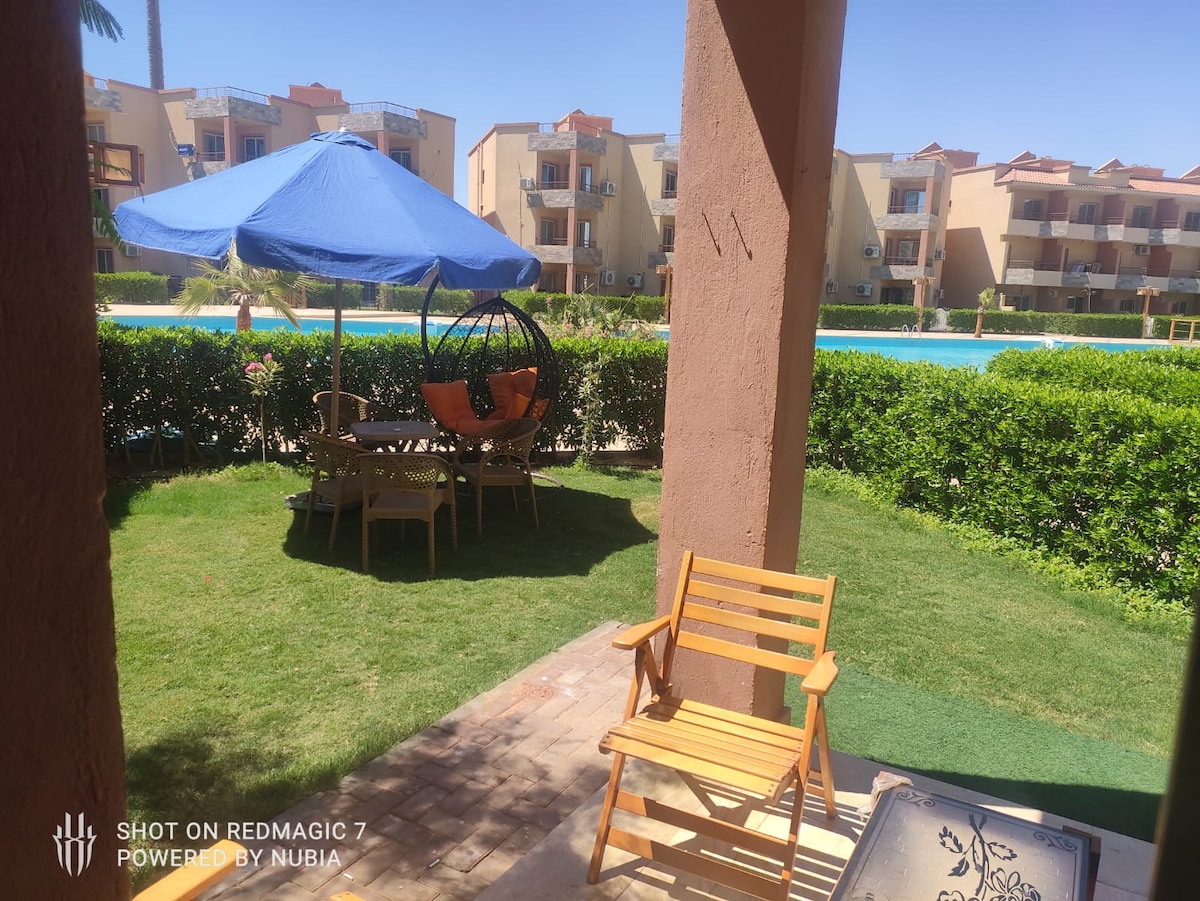 An amazing ground three bedrooms ensuite chalet with a nanny's room and bathroom located in the best community compound in Ain sokhna . All rooms are airconditioned/heated .The chalet has an open concept kitchen with built in appliances , cozy living area .Big cable Tv and WIFI access. Daily housekeeping ,24/7 maintenance ,toiletry and amenities supply , Out door barbeque area We make sure you enjoy a luxurious hassle free vacation .