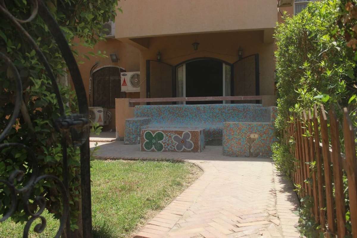 A cozy house in Sokhna, a swimming pool shared by four buildings is only few steps away. A walk to the beach is 5-10 minutes walk depending on your speed. Sokhna is ideal for winter and satisfying for summer, the sea helps ease the summer heat! The house is air-conditioned making it bearable in summer. There is the main entrance near the pool, and the front enterance is a terrace.