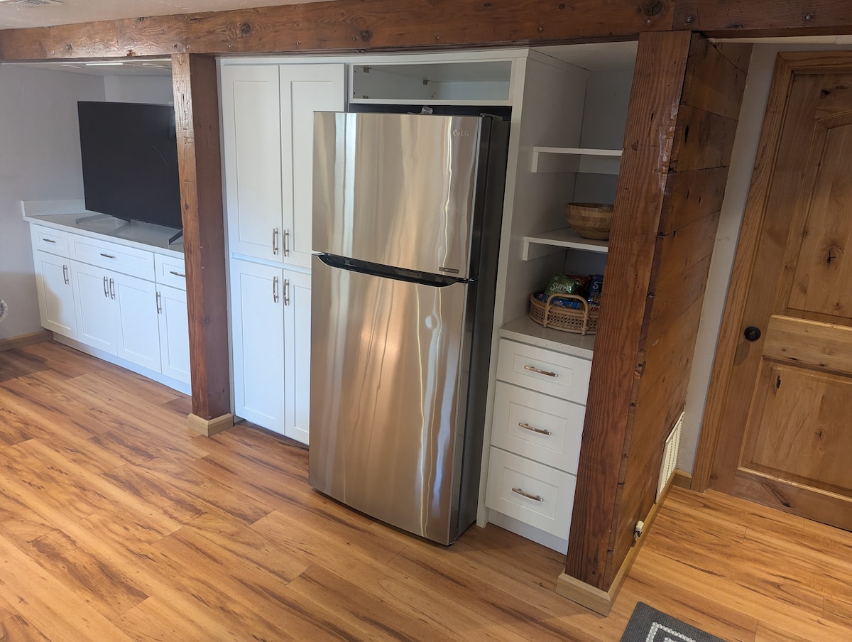 Welcome to your cozy rustic getaway. Settle into this charming suite featuring warm wood accents and a plush queen bed dressed in luxe linens. Enjoy a private bath and a convenient kitchenette stocked with a fridge, Keurig, microwave, and toaster oven perfect for simple meals. Step outside to a peaceful patio w/ a BBQ grill and tranquil waterfall. Whether you're unwinding under the stars or sipping wine by the waterfall. Ideal for couples, solo travelers, or a quiet weekend escape.