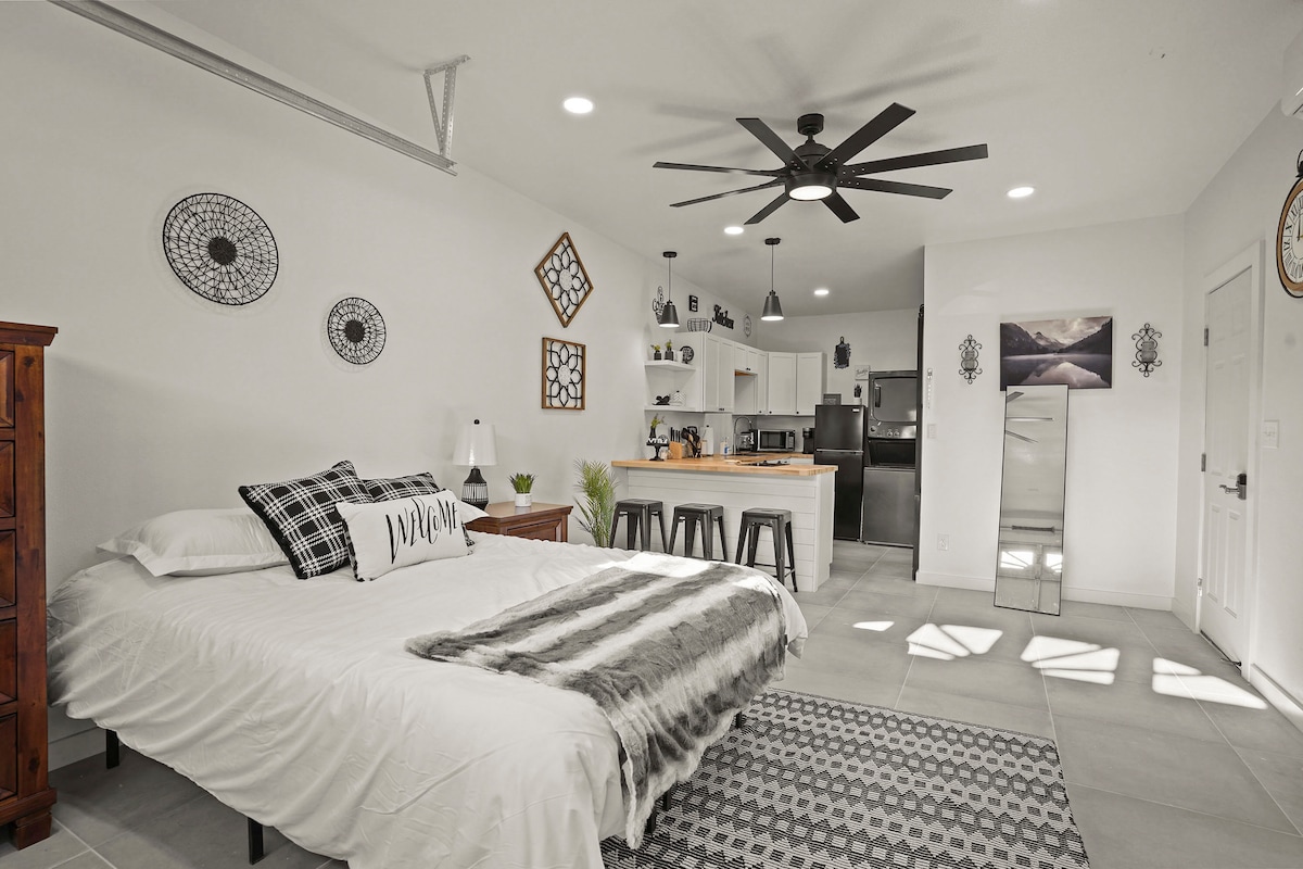 Work, study or explore the beautiful El Paso in this renovated garage studio near the heart of El Paso! Less than 2 mins from UTEP & Las Palmas Medical Center, this space is conveniently located minutes from downtown! The Studio has all of the necessities for your comfort, including a full kitchen, spacious hardwood countertops, brand new in-unit washer & dryer, and SMART TV w/ streaming, free parking & free WiFi. Great for students, medical workers or travelers!
