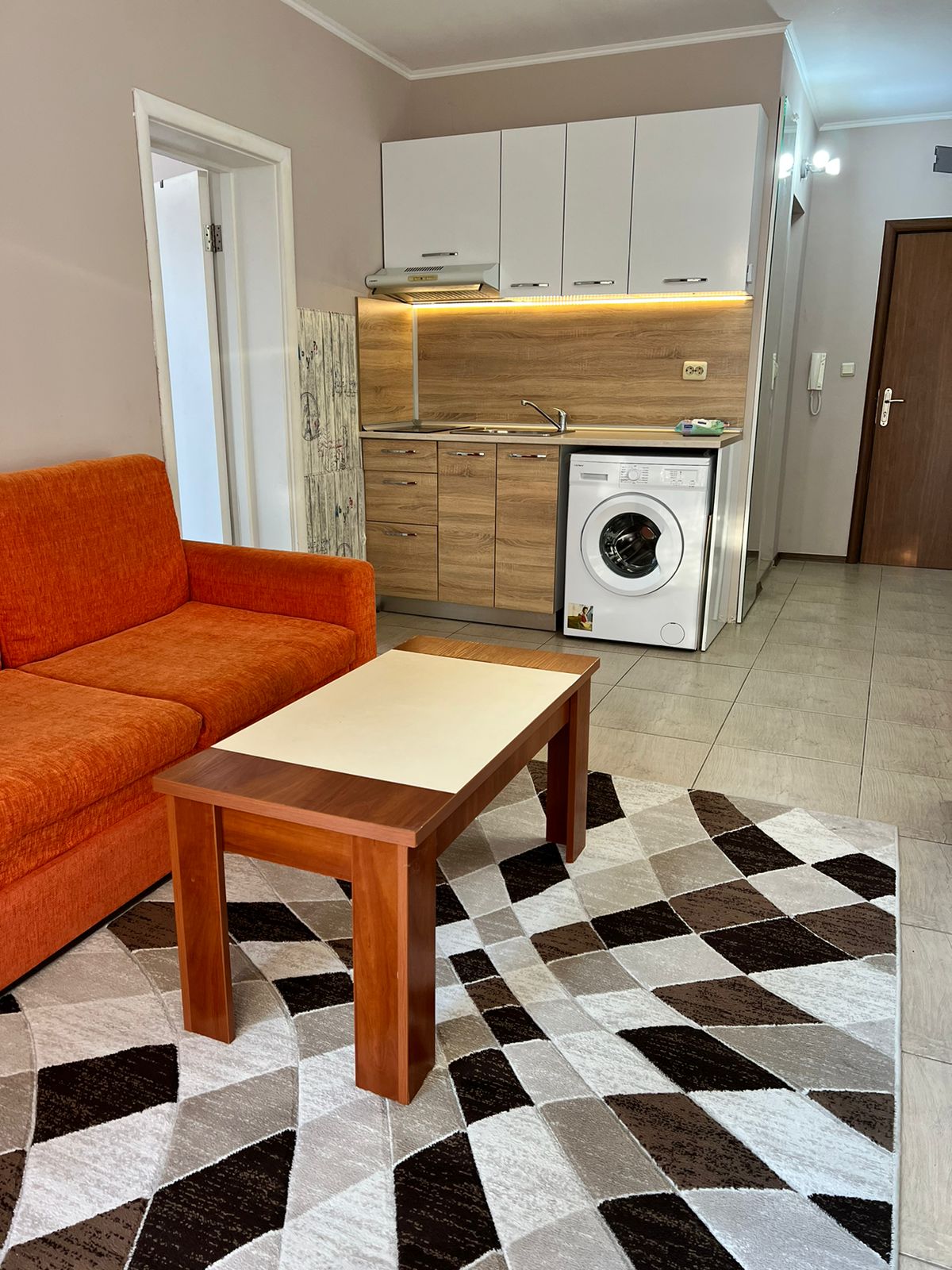 A modern, fully equipped ground-floor apartment, ideally located between charming Nessebar and Sunny Beach. It features two rooms: a living room with a double sofa bed, a bedroom with a double bed. The living room has an open-plan kitchen, airco, TV, a terrace, a dining table & four chairs. The bedroom has airco and a door leading to the terrace. There are two swimming pools (free) 20 and 60, aquapark. Two supermarkets within 50 meters, restaurants, and cafes are within walking distance.