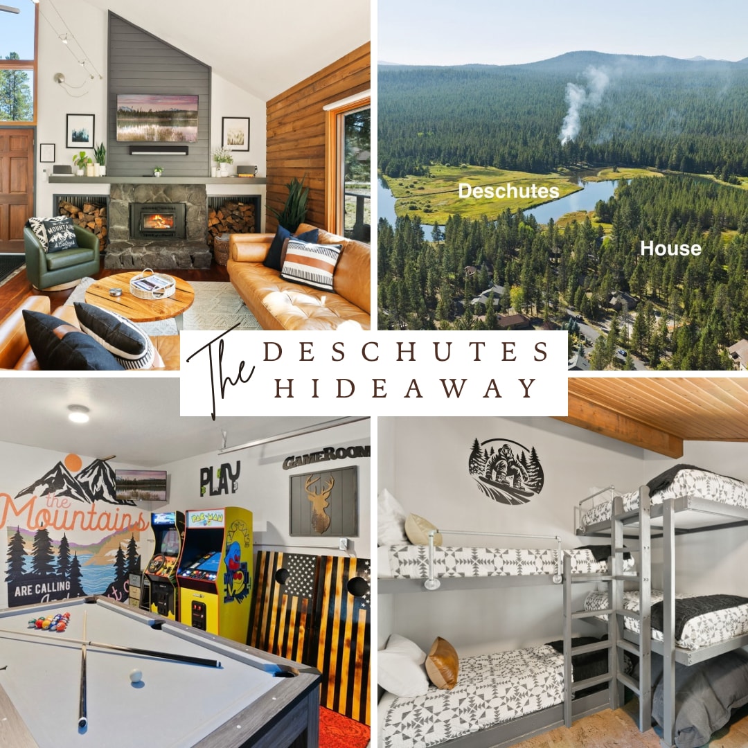 Stylish luxury family home w/8 SHARC passes (pool & lazy river), 6 Cruiser bikes, Hot Tub, 3 New Smart TV's for streaming, Ping Pong table, board games. Short walk to the river & Cardinal Landing Bridge. Fast 1GB WiFi, propane BBQ, Air Conditioning, cozy wood burning fireplace. Fully stocked kitchen for cooking, laundry inside. Quiet + Private w/large deck backing up to natural common space w/wildlife walking by. Bike everywhere w/easy access. Minutes to Mt Bachelor for skiing & sledding.