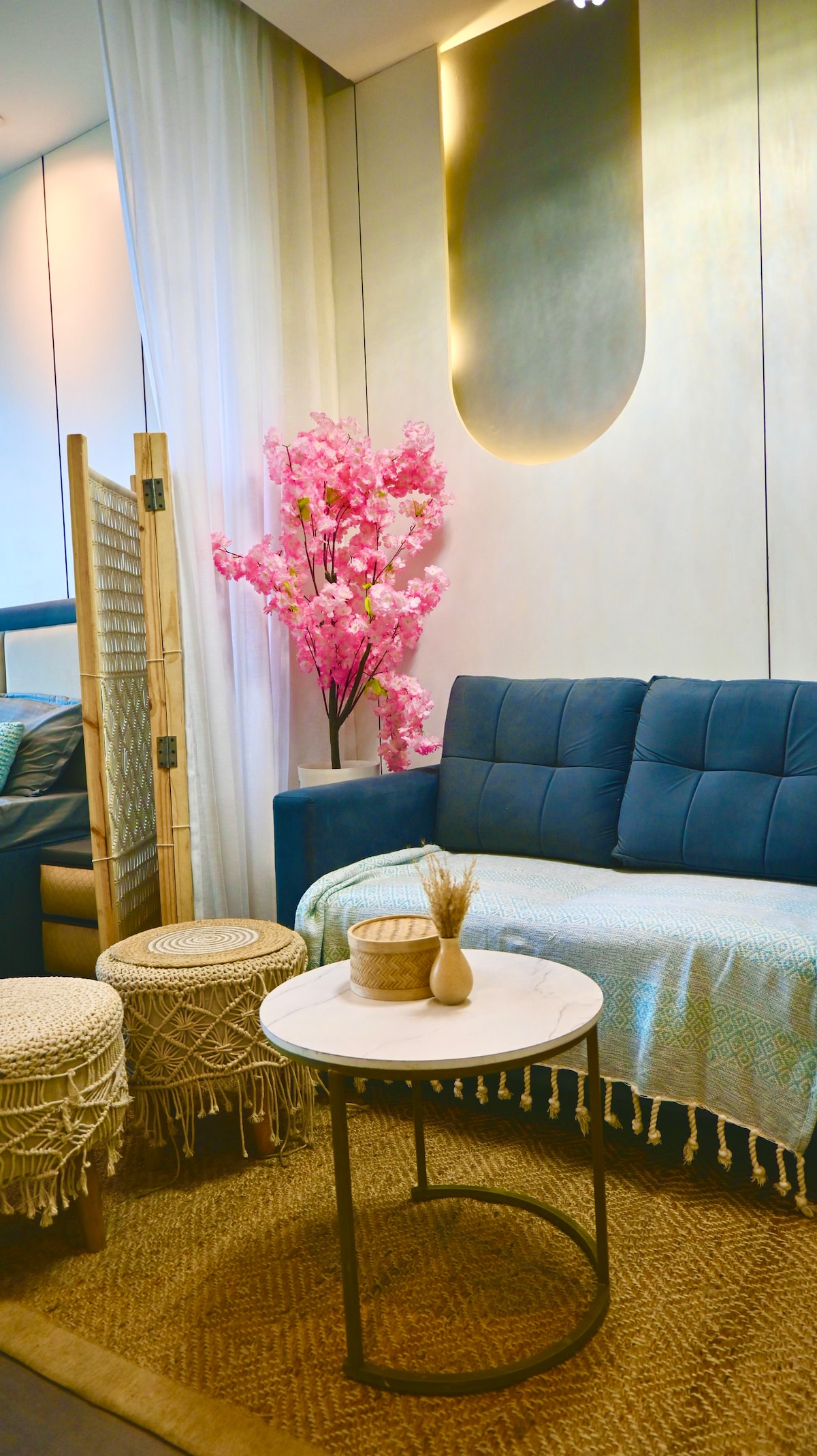 One of the most loved boho stays in Supernova with a stunning Yamuna sunset view perfect for couples & cozy luxury escapes. Step into a romantic boho-style studio with a breathtaking Yamuna view, designed for those who love cozy luxury and unforgettable moments. Wake up to soft sunlight pouring through the balcony, sip your coffee with a serene river view, and unwind in the evening with golden sunsets right from your room.
